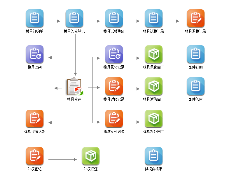 2、完善的模具运行体系,从模具订购到上机回库、上架的全程管制,完备的将我公司的管理体制固化在系统中,将所有的工作拖沓、胡乱试模、发模。扼杀在摇篮中以达到管制一体化。